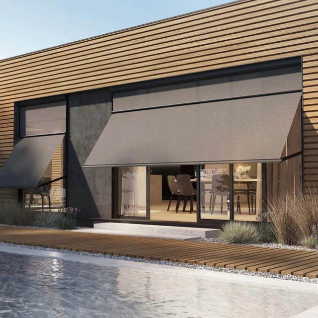 Een combinatie van uitvalscherm en screen voor betrouwbare bescherming tegen de zon en een product dat een gevel kan verfraaien.